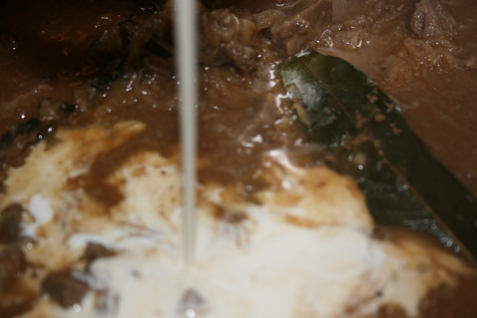 Add roast, consommé, broth, Worcestershire, bay leaf, and thyme.
