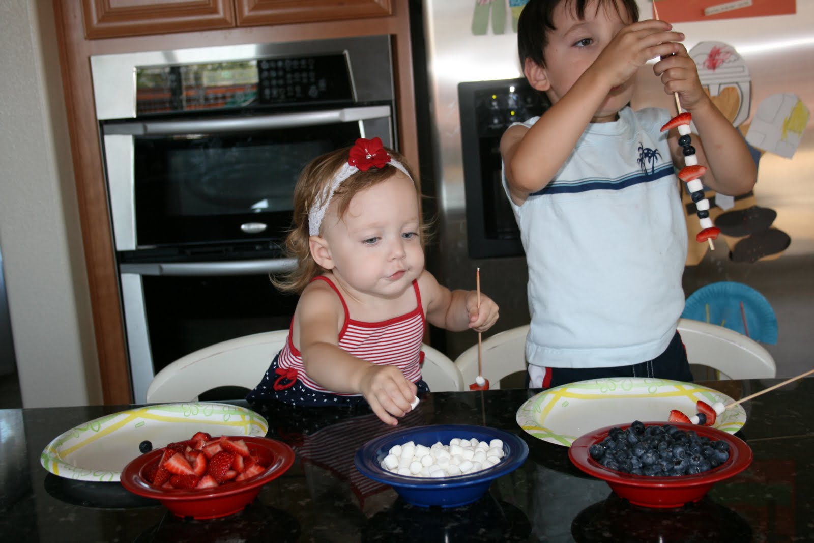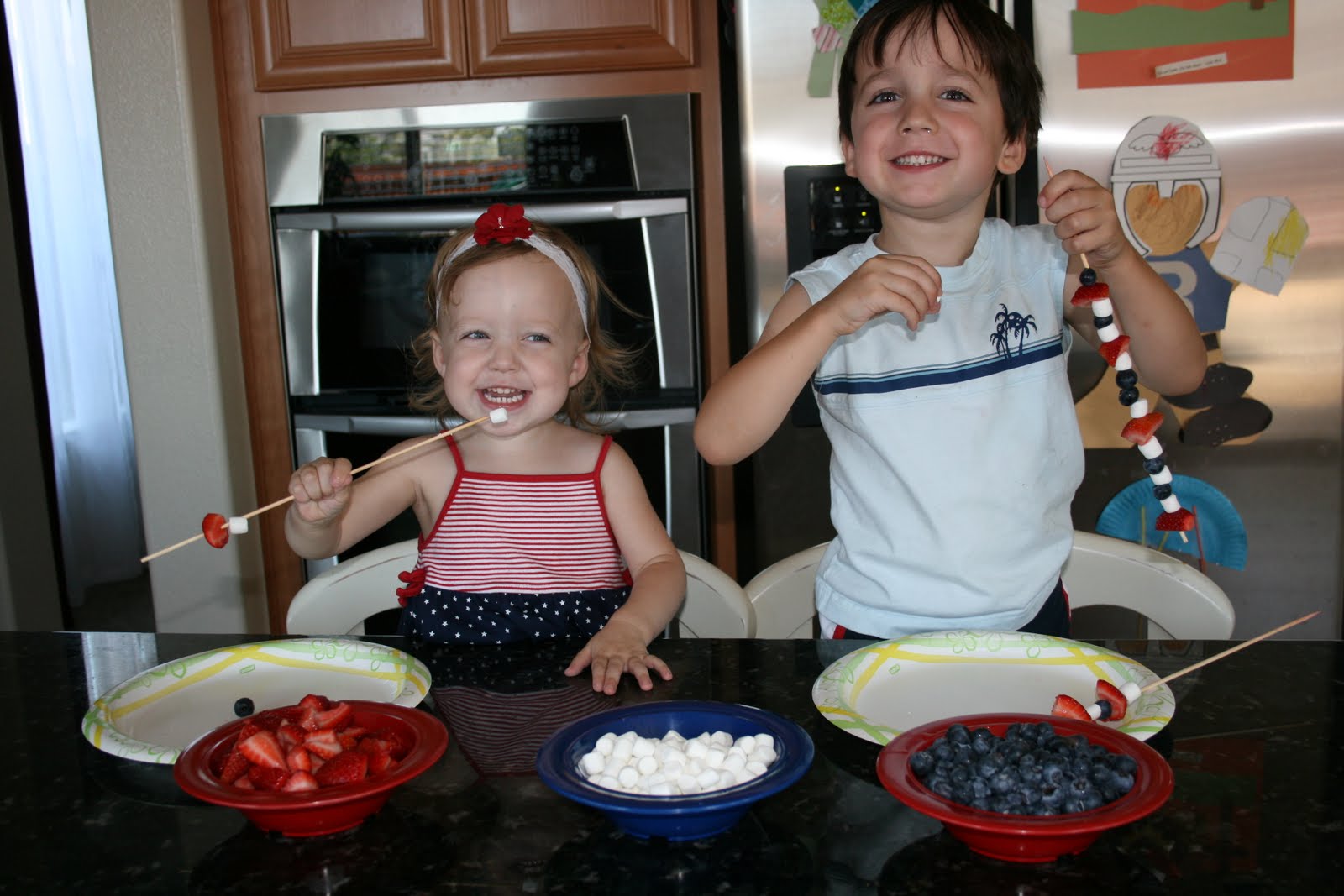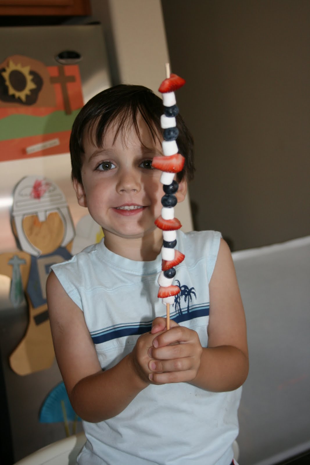 This isn’t really a recipe, it is more a food related activity to do with the kids.  I was looking through old pictures and found these ones of my kids making these kabobs last year for the 4th of July.  They absolutely loved making and eating these.  Now remember these were taken last summer.  Caleb was 4, Bella was 2 and Drew was 1.  Please excuse the snotty noses, we had been hit with a little summer cold virus.  Oh and don’t let the poor quality photos and snotty nose kids turn you off, these are definitely an activity worth doing with the kids.
