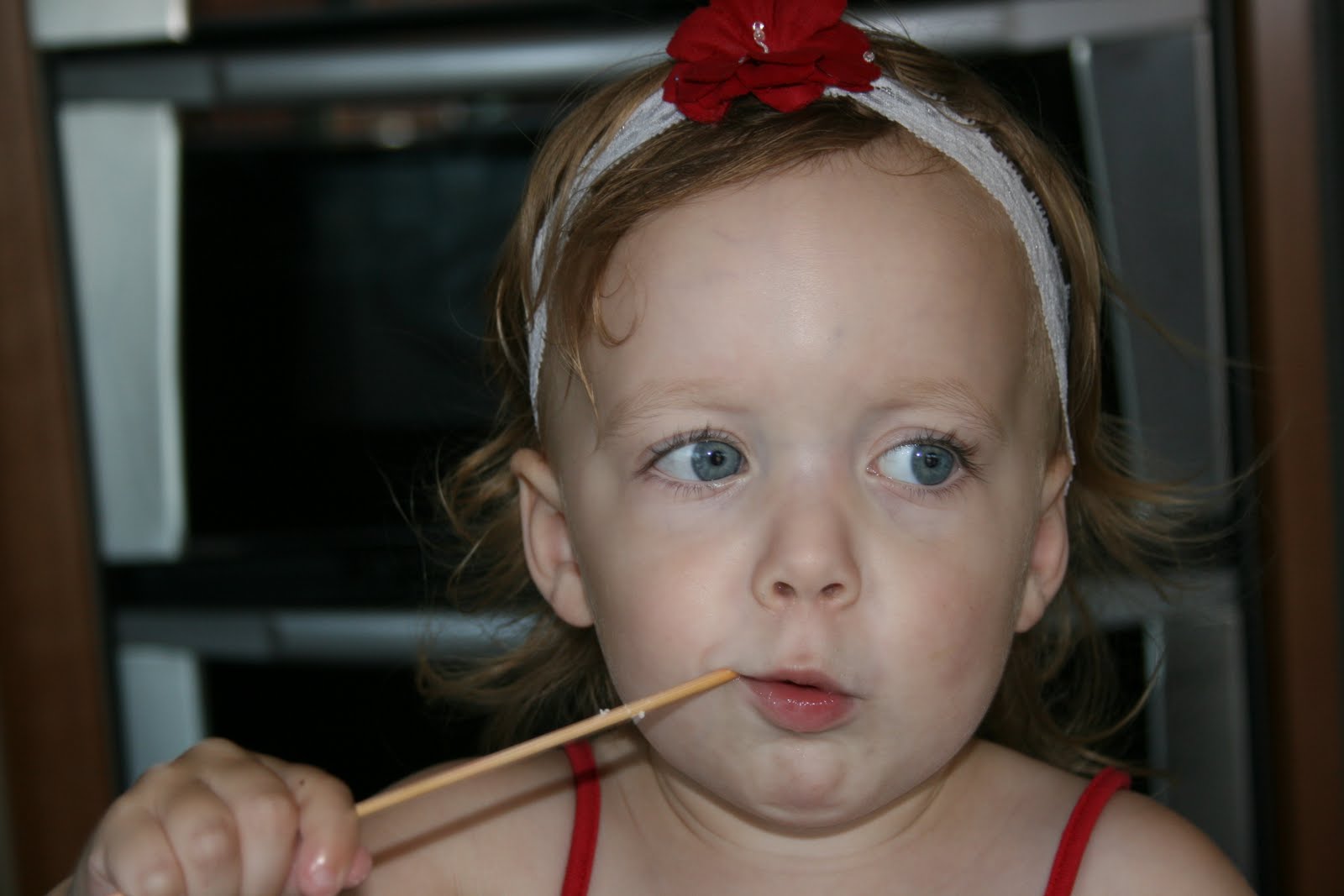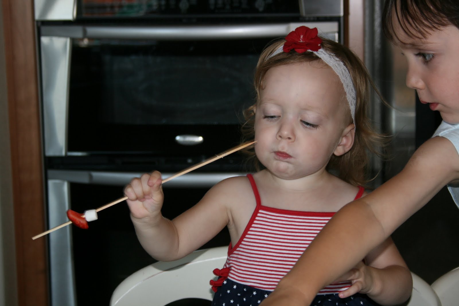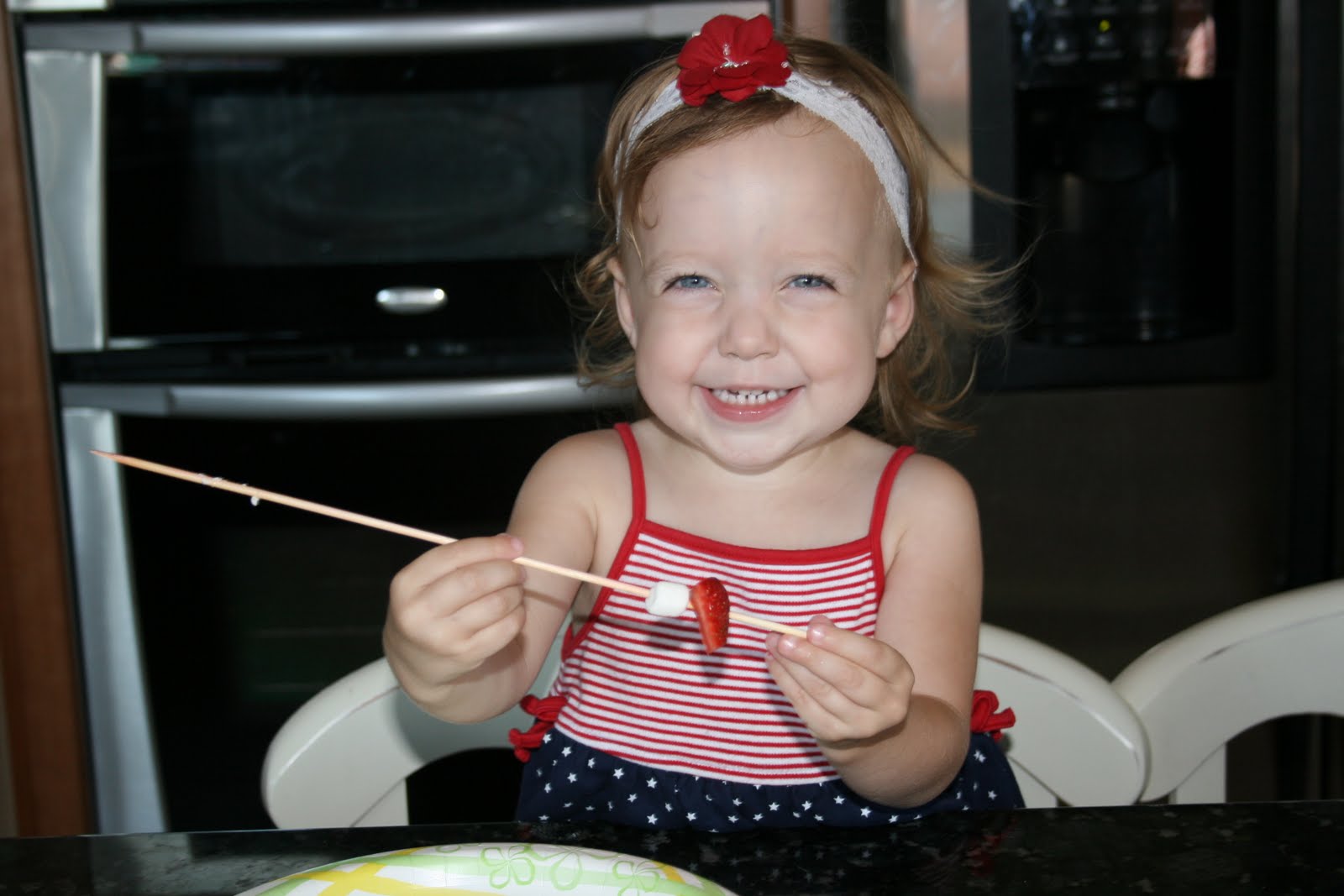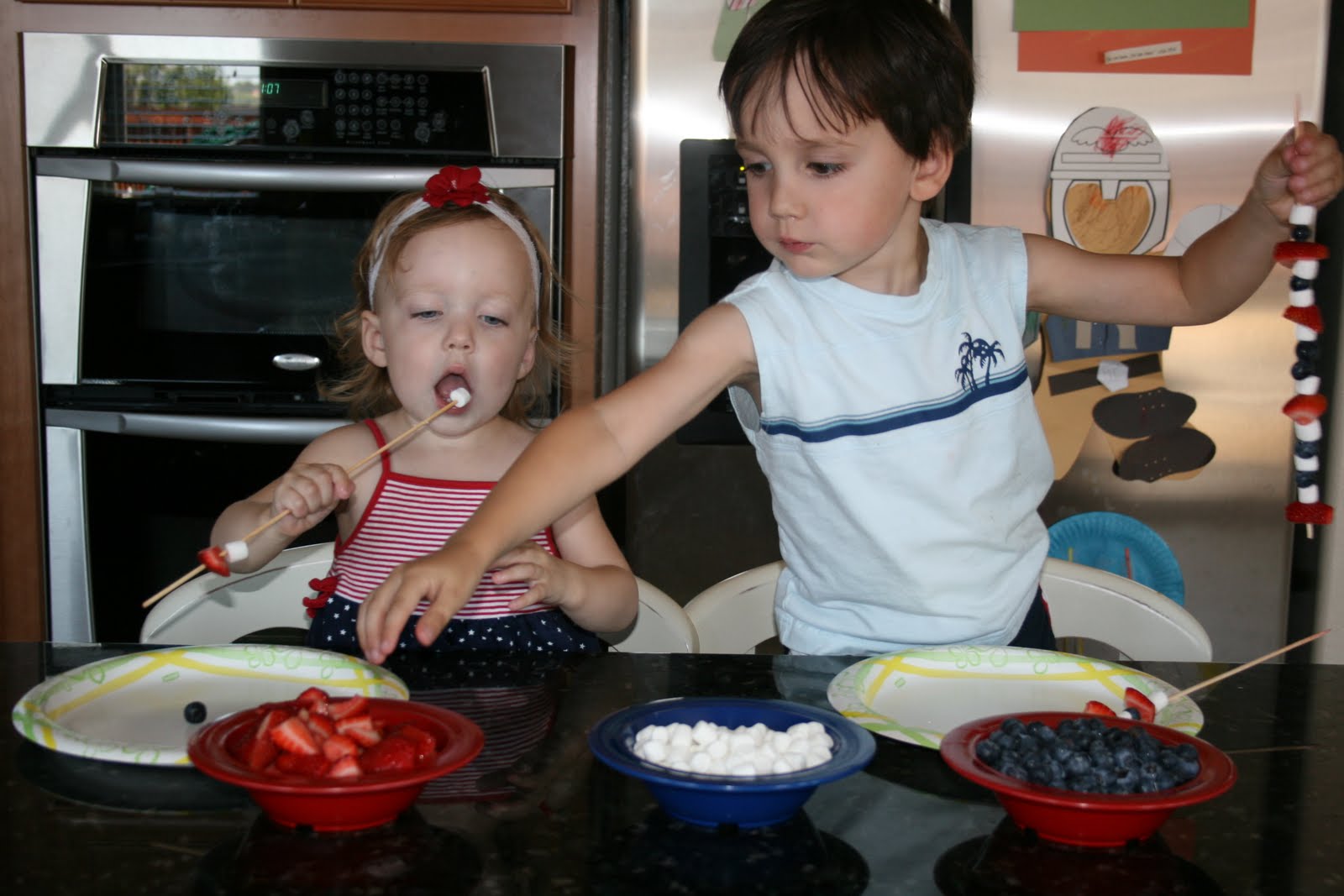 This isn’t really a recipe, it is more a food related activity to do with the kids.  I was looking through old pictures and found these ones of my kids making these kabobs last year for the 4th of July.  They absolutely loved making and eating these.  Now remember these were taken last summer.  Caleb was 4, Bella was 2 and Drew was 1.  Please excuse the snotty noses, we had been hit with a little summer cold virus.  Oh and don’t let the poor quality photos and snotty nose kids turn you off, these are definitely an activity worth doing with the kids.