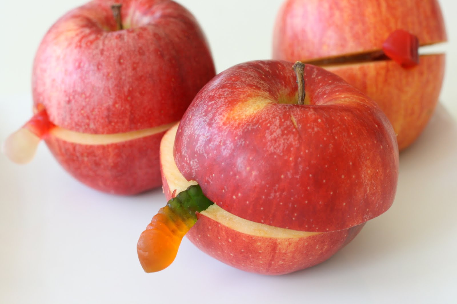 Place a gummy worm into the center of each apple and out through the hole.